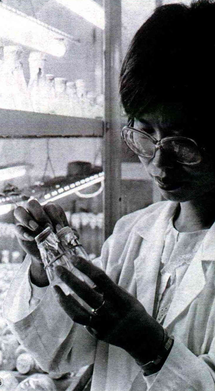 1. This year's Ten Outstanding Young Women after receiving their awards from Governor Li Teng-hui. 2. Chien Ming-sai, outstanding in the field of academics, with her family. 3. Chien Ming-sai at work in the laboratory.