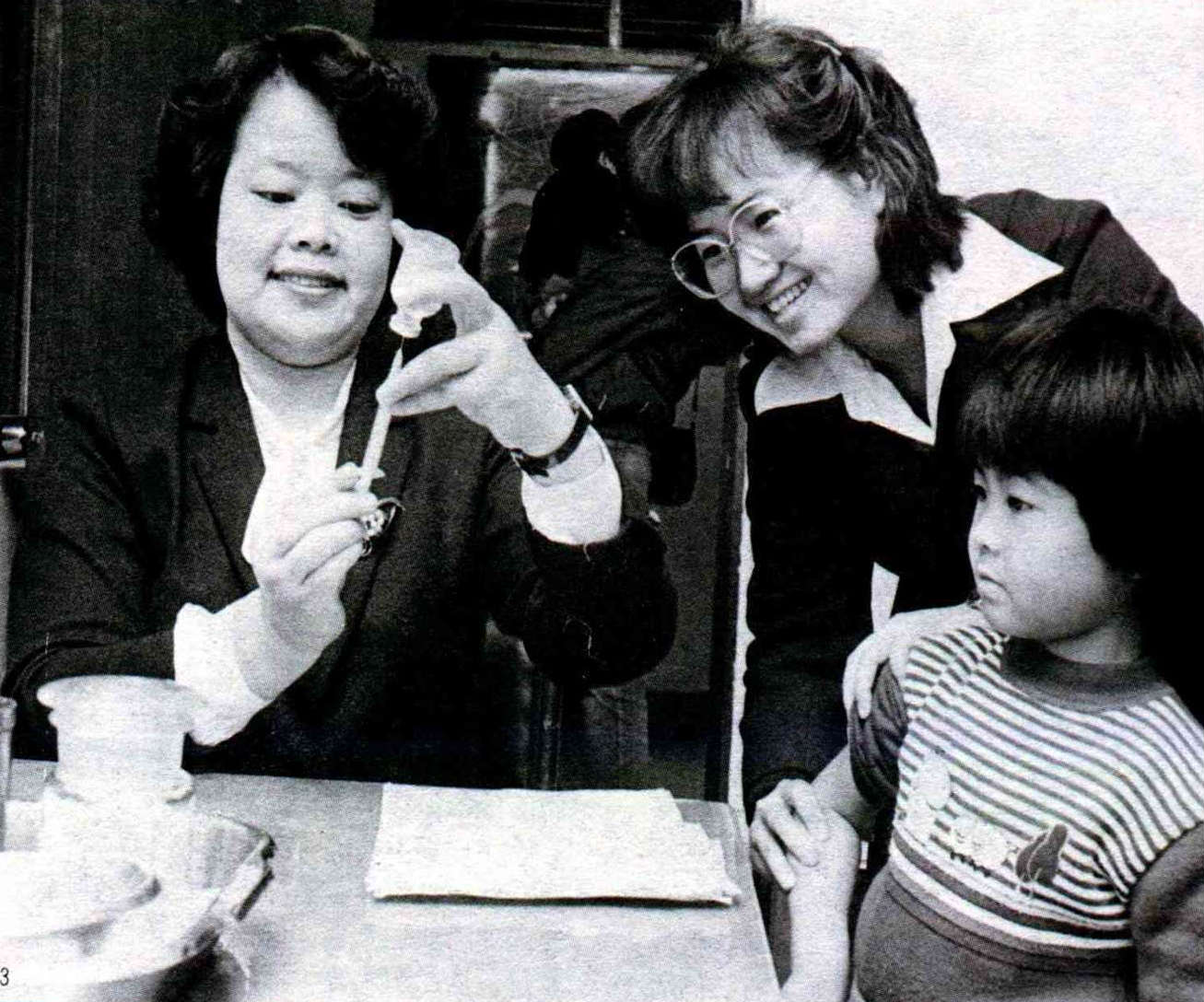 1. Judge Hsu Pi-hu was chosen as the most outstanding young woman in the law field. 2. Chou Pi-se has dedicated her career to promoting cancer prevention. 3. Nurse Tsuo Ju-mei vaccinates a child in an outpatient clinic.