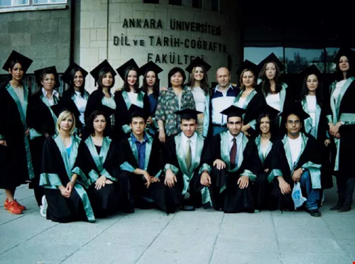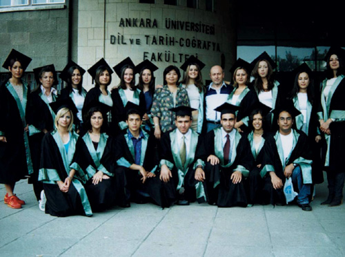 Each year, Ankara University's Chinese department takes in 35 students. Ankara University and Taiwan's National Chengchi University exchange students and teachers through their sister university relationship. Pictured are the writer, her husband Bulent Okay, and students of the Chinese department at their graduation ceremony.