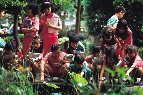 In the area behind Taipei Railway Station, where the traffic snarls on Chengde Road, we make a quick turn onto Jinxi Street. There, across from Jiang Weishui Memorial Park, is Shuanglian Elementary, a school founded 67 years ago. In the middle of the city, we see an oasis of green with a pond, a stream, plant life, and a scenic footpath. There are some boys crawling around in the grass looking for frogs and some girls scooping up lotuses from the pond.