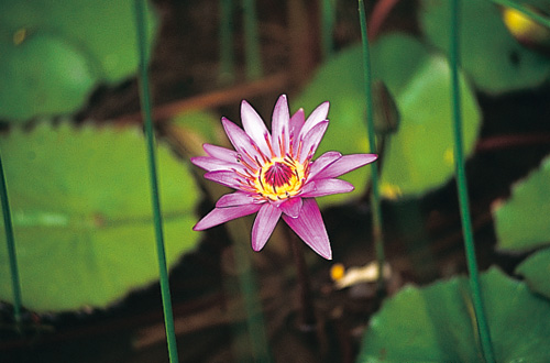 At the ecological pool, a fourth-grader counts off the aquatic vegetation he knows for his visitors: scouring rush, soft rush, white lotus, water hissop, chameleon, umbrella sedge, Indian lotus, water lettuce, oriental cattail.... Once he's finished, he turns around and asks, "How many do you know?"