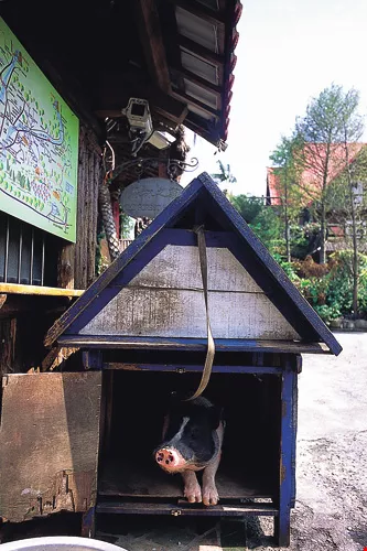 A small pig quietly curled up in its pen. At Shangrila, with natural scenery as its main appeal, miniature pigs are the only animals raised expressly for the enjoyment of guests.