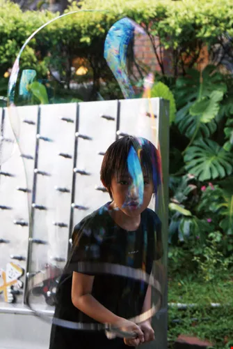 Making a giant soap bubble. Children who come to the farms find pleasure in simple childhood activities.