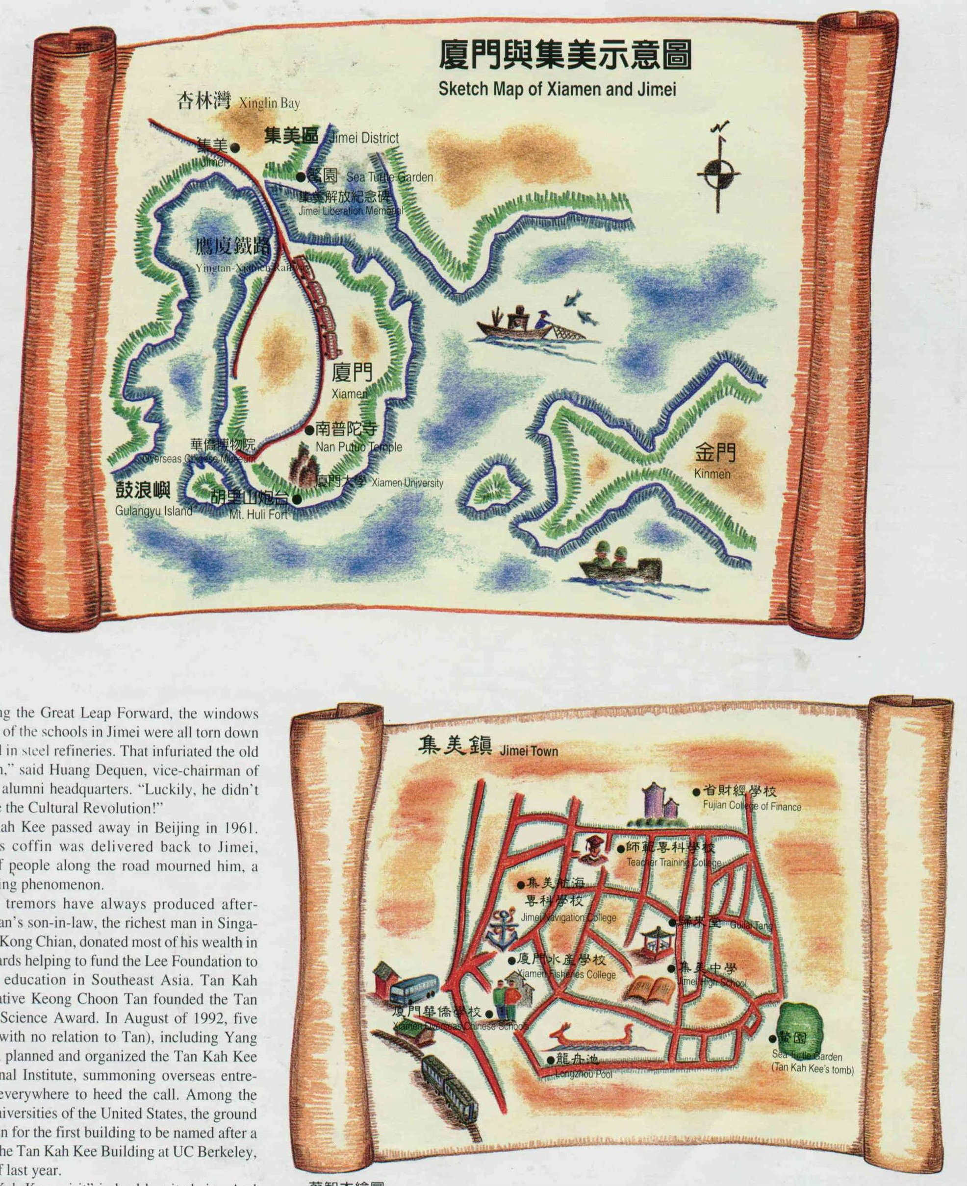 Xiamen's Jimei district, the birthplace of Tan Kah Kee, was originally nothing but a forlorn and remote little fishing village. Many of its inhabitants made their living by traveling off to Southeast Asia to labor and start up businesses. Tan's father was one of these, making his own sojourn to Singapore and running a rice store there.
