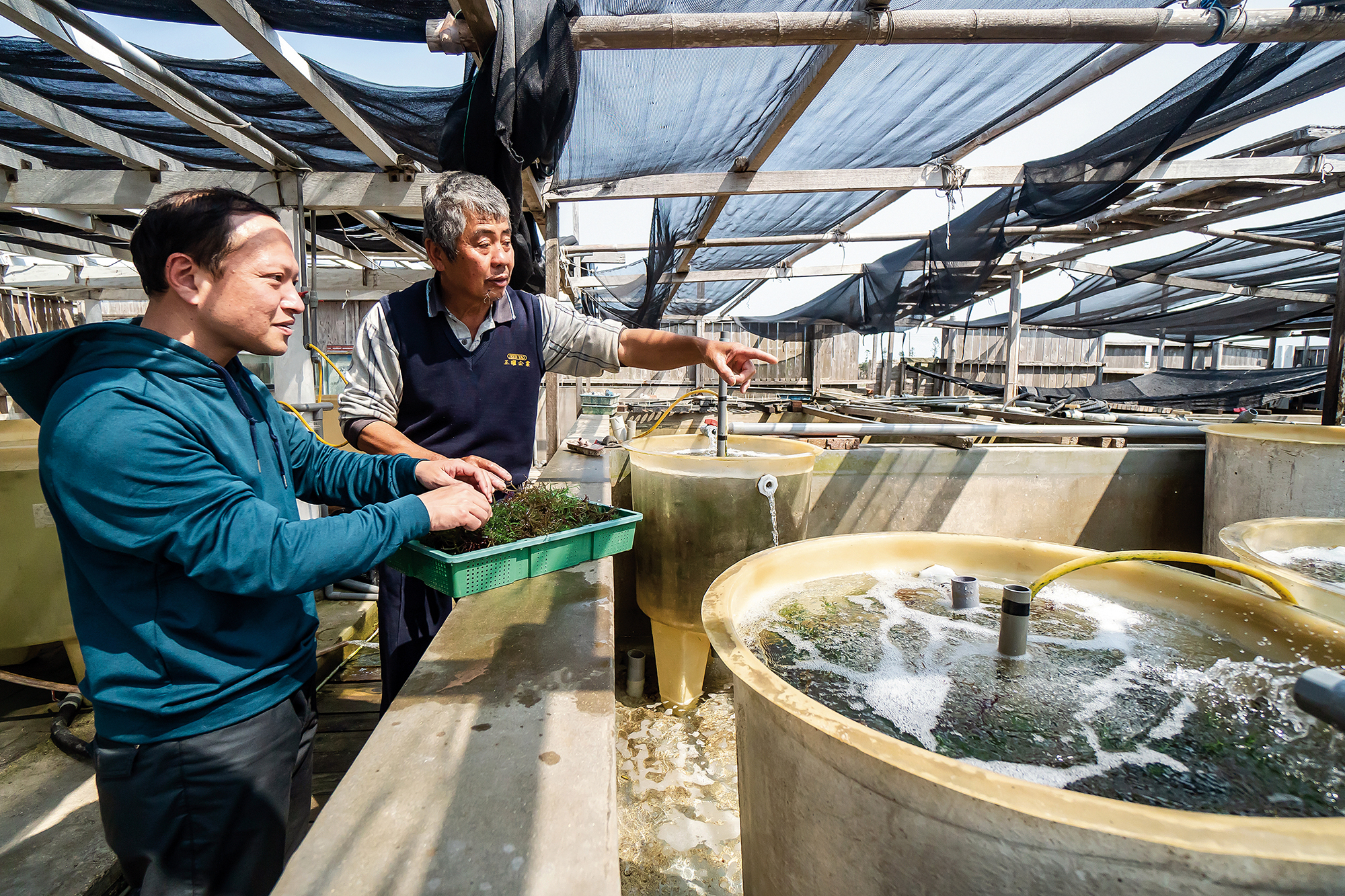 Seaweeds proved to be challenging to grow, and Ke turned to Hisao Ogawa, a Japanese visiting professor at National Taiwan Ocean University, and the faculty of National Penghu University of Science and Technology, for help. Though all were very generous with their knowledge, Ke remained stalled for more than a year. “For reasons I don’t remember, I ended up buying a really long air hose. When I put it in the cultivation barrel, the Caulerpa lentillifera started to grow.” Chuckling, Ke explains, “The hose created a strong current, which was just what this seaweed needed.” The current enabled the Caulerpa lentillifera to grow to a length of ten centimeters and produce dense clusters of sparkling “sea grapes.”