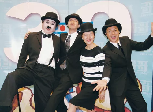 At Chickabiddy's 30th anniversary celebration, Tao (at left) played Charlie Chaplin in a skit with his wife and son.