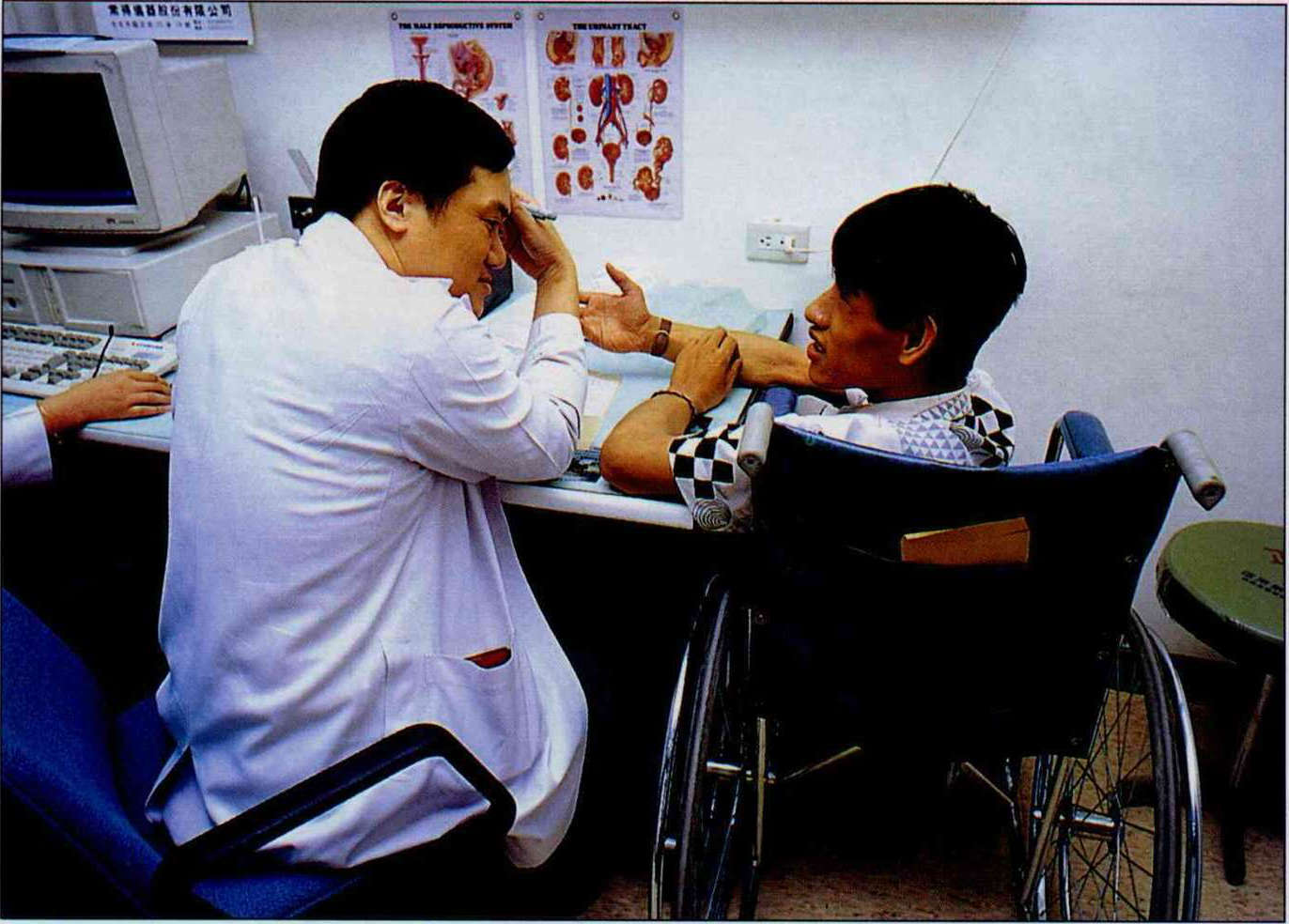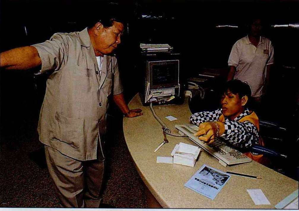 Surrounded by a wall of inquisitors, this young man of only 30 kilograms looks especially frail. But as you watch he handles an endless stream of questions, answers the phone, and occasionally dexterously toys with the computer. Obviously he is in no way inferior to even senior volunteers in terms of his knowledge of every nook and cranny of both the old and new buildings of the hospital. And every once in a while a more attentive passer-by will recognize him, and blurt out in surprise, "Are you Chung-jen or Chung-yi?"