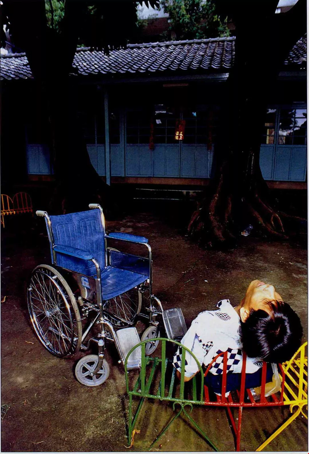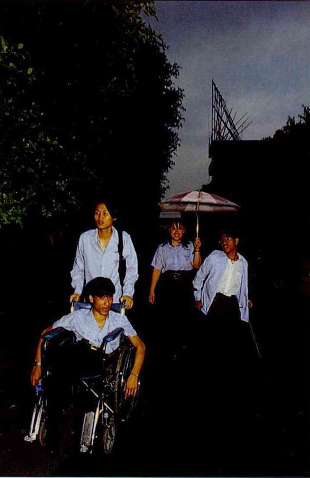 What friends would those be? Chung-yi always goes downstairs to the restaurant, where he visits Mama Yen, his "adoptive mother," and the young students who work there. Here he often runs into a little tornado of friendship. Meanwhile, Chung-jen goes back and forth in the halls of the old and new buildings. Most of the time he is just roaming around killing time, though sometimes when he thinks of it he will head to some special corner of the complex to visit one of his more familiar friends. If his friend is busy he will wait quietly at the door until his friend looks up and notices him, and he will give an exaggerated smile, wave, and say hello. If his friend isn't available, there's no harm done. "He (or she) is busy. It wouldn't be right to disturb his (or her) work." So he just quietly pushes his wheelchair away. It's not necessary for him to say anything, yet he is painfully lonely. But everyone has their lives to attend to, and no one can permanently fulfill this young man's need for friendship.