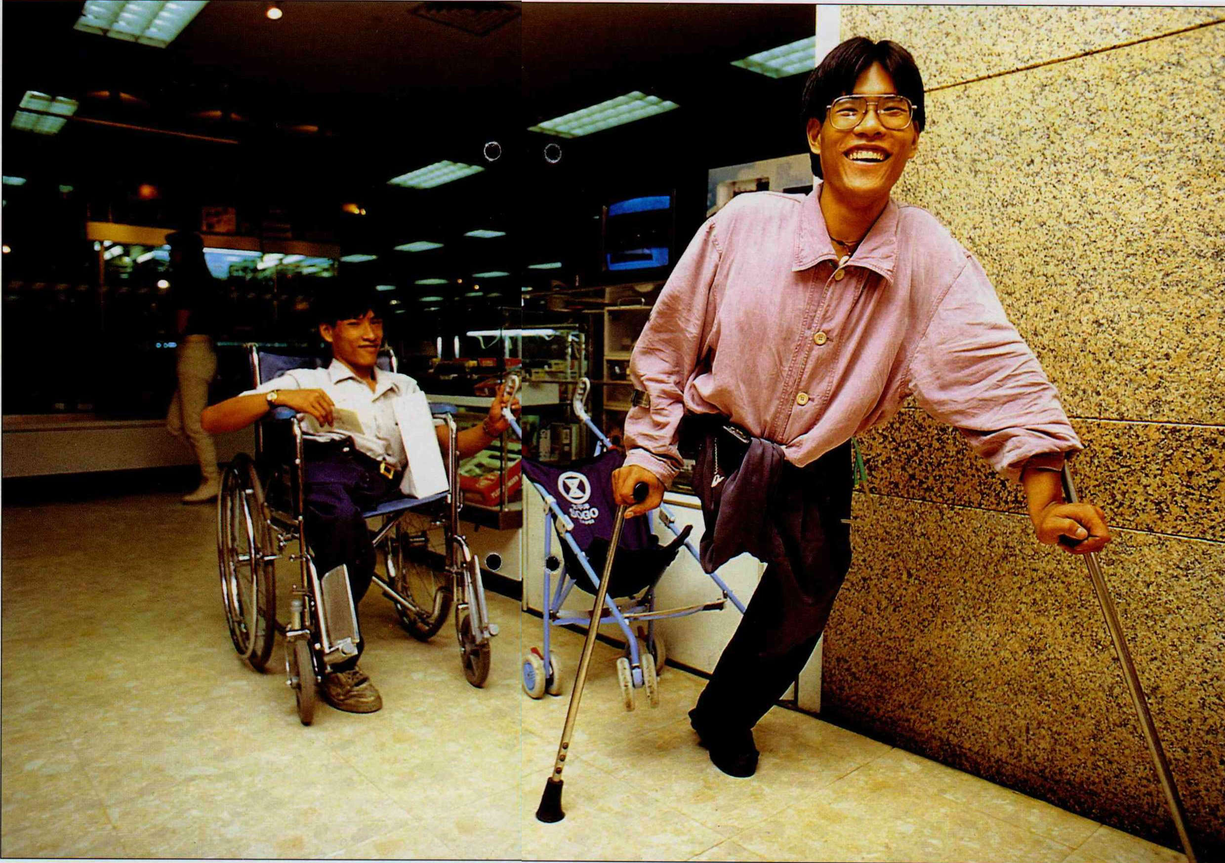 It is Chung-jen, the "elder" brother, and he has been serving as a volunteer for over a year now. But it's not hard to find Chung-yi if you want to: When volunteer shifts change, Chung-yi usually shows, perhaps walking with crutches, perhaps in a wheelchair. And if he doesn't appear, that means he must be somewhere else in the hospital doing something for his friends. Although they were born attached together, these identical twins share no special sixth sense; if one wants to find the other, he'll have to try the pager a few times like everyone else.