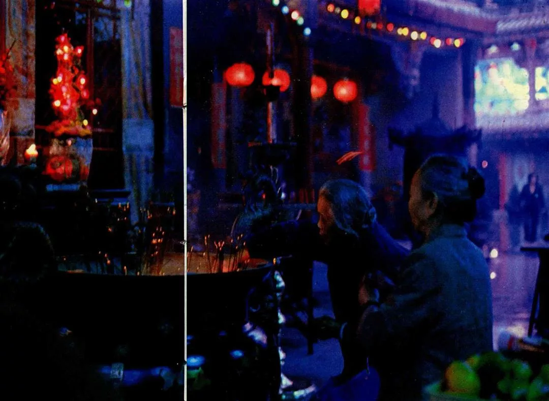 The afternoon sun shines through the smoke of burning incense at Taipei's ancient and revered Lungshan Temple. Inside, a white-haired woman holds a bundle of incense sticks, and after lighting them, fans them out and slowly walks over to the statue of the Buddha. She pays homage by slowly waving the sticks up and down, and then makes her request to the Buddha as the smoke spirals upwards with her prayers and hopes.