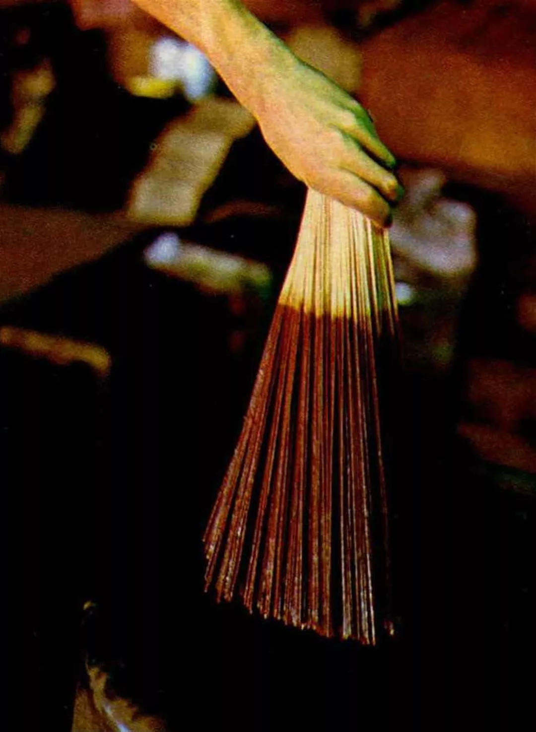 1) The scented paste used in the manufacture of incense. 2) Only after soaking in water can the sticks be coated with incense. 3) Incense must be handled correctly. 4) Bundles of incense are dried in the sun. 5,6) Workers lay the incense out to dry.