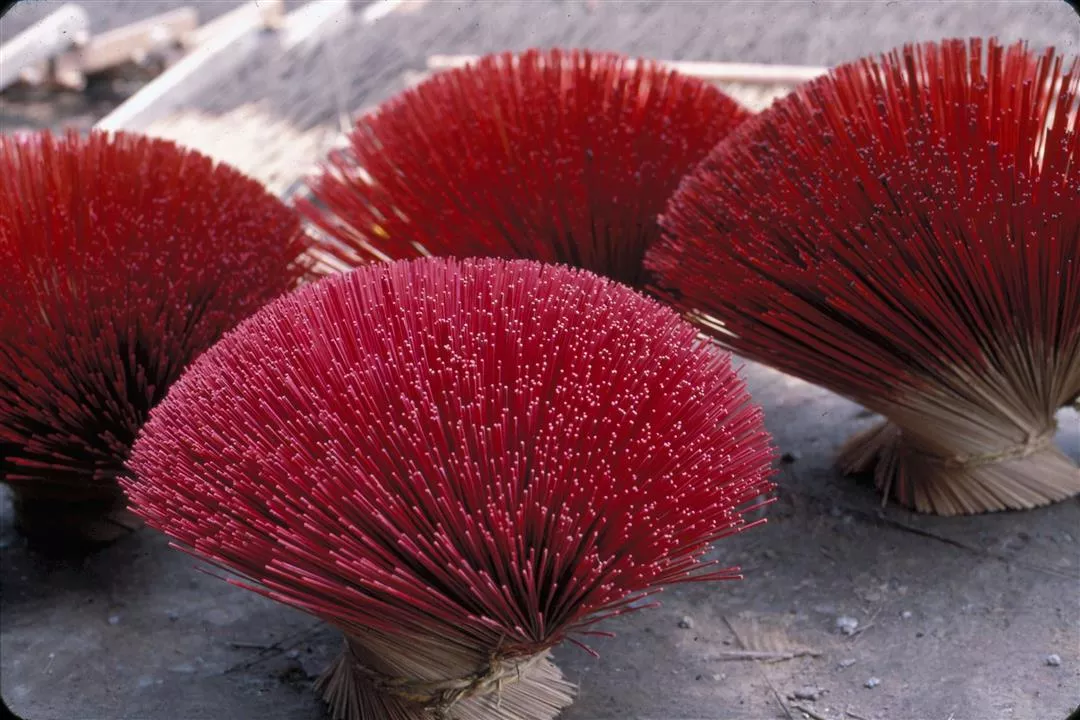 Most of the factories in Taiwan are family owned, and employ only two or three workers who produce the incense by hand. Hung Yao-hsiung of the Chin Sheng Temple in Wanhua in the old part of Taipei, described the manufacturing process in detail. First, several bamboo sticks are about three-quarters immersed in water and then spread into a fan shape before they are rolled in a fragrant paste. After the sticks have been coated, they are placed outside to dry.