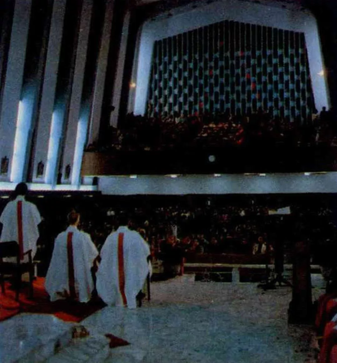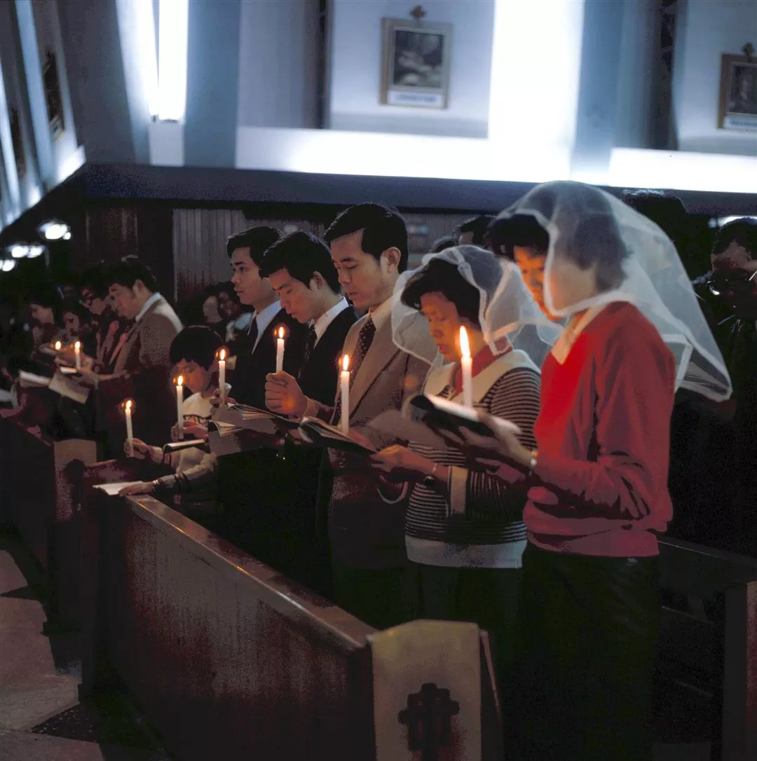 Opposite: After the mass is over, the worshipers kneel down in front of the altar to receive holy communion. Right: Midnight mass is the most important event of the Catholic church in a year. Far right: Tien Educational Center is one of the most important cultural and educational activities center for young men set up by the Catholic church.