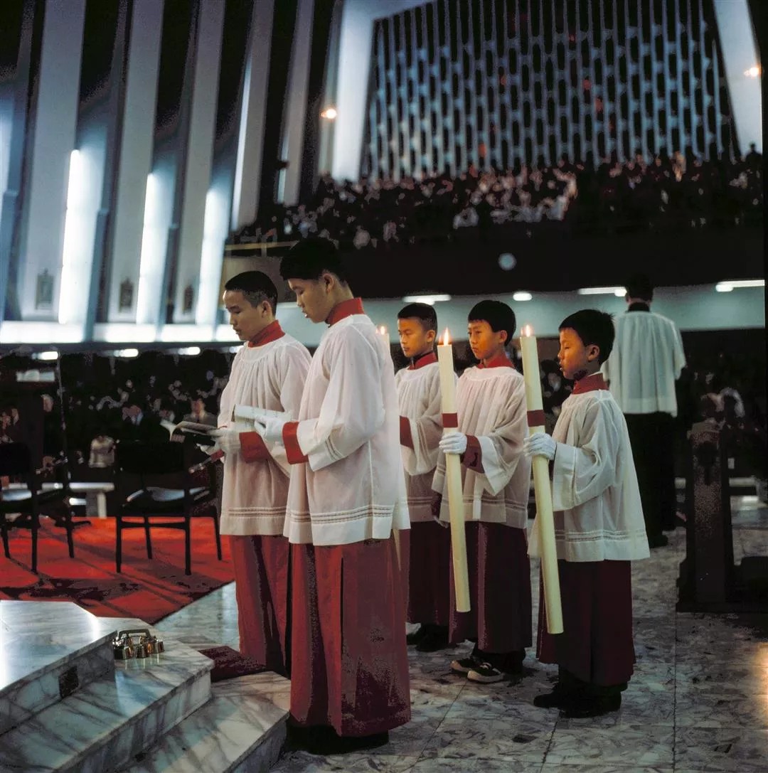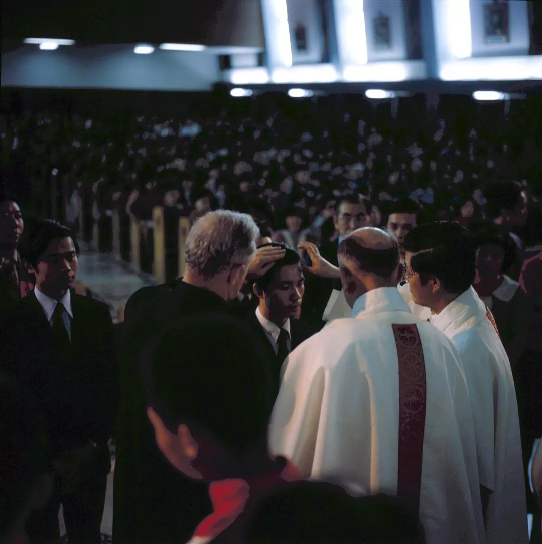 Left: When fathers are preparing for the mass, the altar boys stand by. Below: In the ceremony of baptism, fathers anoint heads of worshipers to make them strong in their belief.