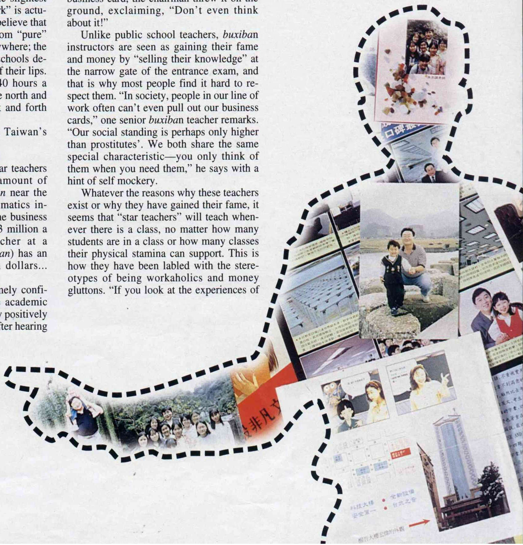 When buxiban teachers work with all their might like this, it is often not merely for the sake of fortune and fame. "I have a passion for teaching," one young instructor states. When he was a university student, he had already begun teaching buxiban classes. Inducted into military service, he had no place to teach. Knowing that his company commander wanted to test into college, he went brimming with ambition to him and said, "Sir, if you let me teach, it will mean you'll have a class to attend." And just like a singing star, "the most unforgettable thing is the gleam in all those eyes staring up from in front of the lectern," one teacher relates, as well as that "feeling of being needed."