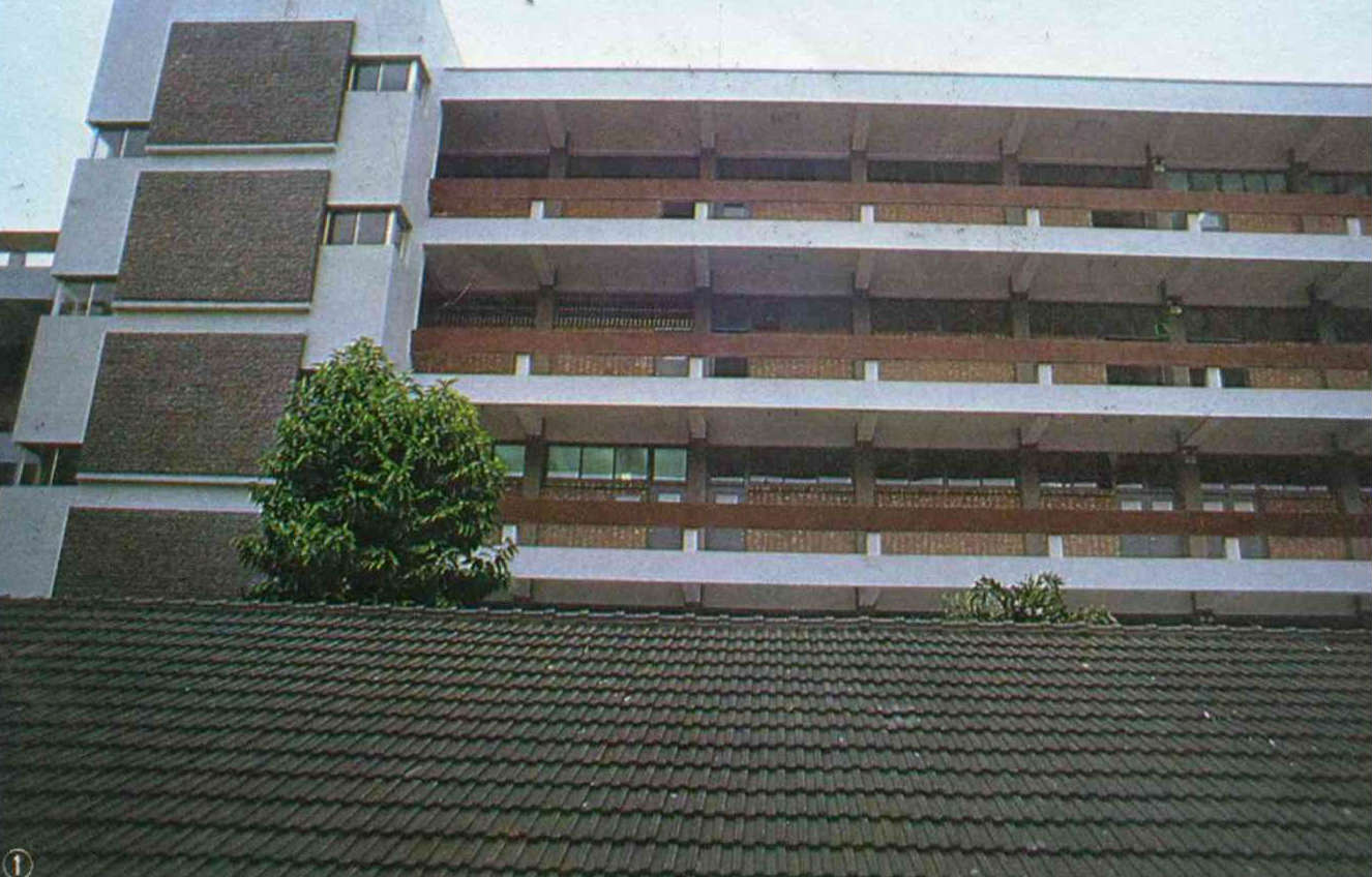 1 . Relaxing after class, students chat on a terrace. 2. A panoramic view of the University campus from the library. 3. The latest campus news is available on the student bulletin board. 4. The gnarled roots of a Banyan tree. 5. The background silhouette of a young couple seen behind a sprig of fresh flowers. 6. Stately Banyan trees grace the University campus.