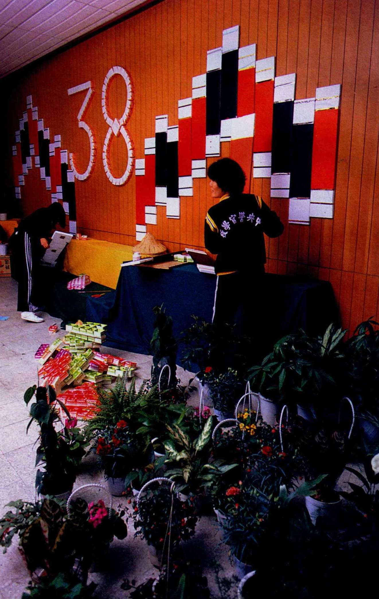 Coeds at the college hold a charity sale in celebration of Women's Day.