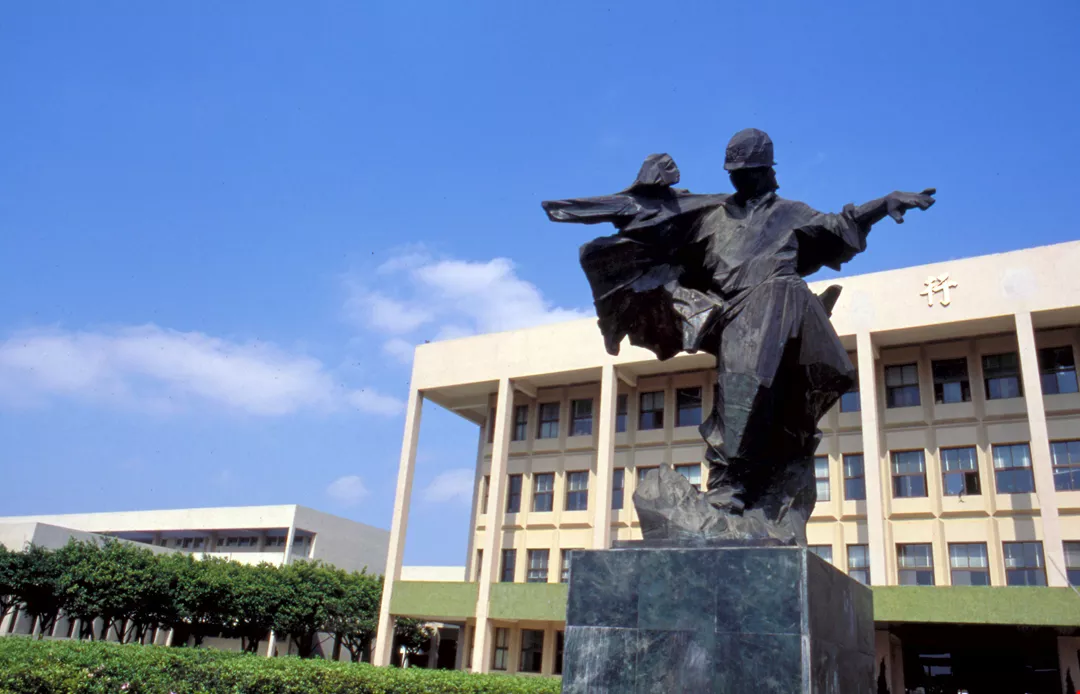 A police officer rescuing a little girl symbolizes the college's spirit of serving the people. The sculpture is by Chu Ming.