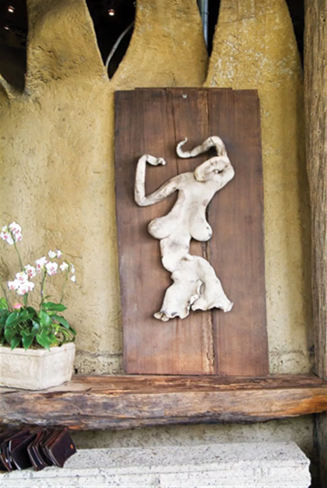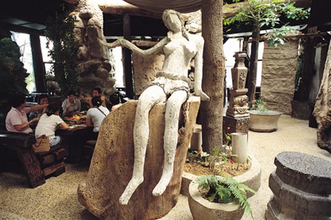 Large clay sculptures began to appear at the Taichung branch, known to locals as the "mud dream-house." Above the entrance, four young girls, hand in hand, gaze down on the guests, and within the restaurant is a corridor formed by an arched concrete wall, conveying the distinctive style of a grotto, a departure from typical restaurant layouts. Two female clay statues extending from the wall to the ceiling, a floral relief, and the numerous clay sculptures of women hanging on the wall give visitors to Five Cent Driftwood House the feeling that one is stepping into an art gallery.