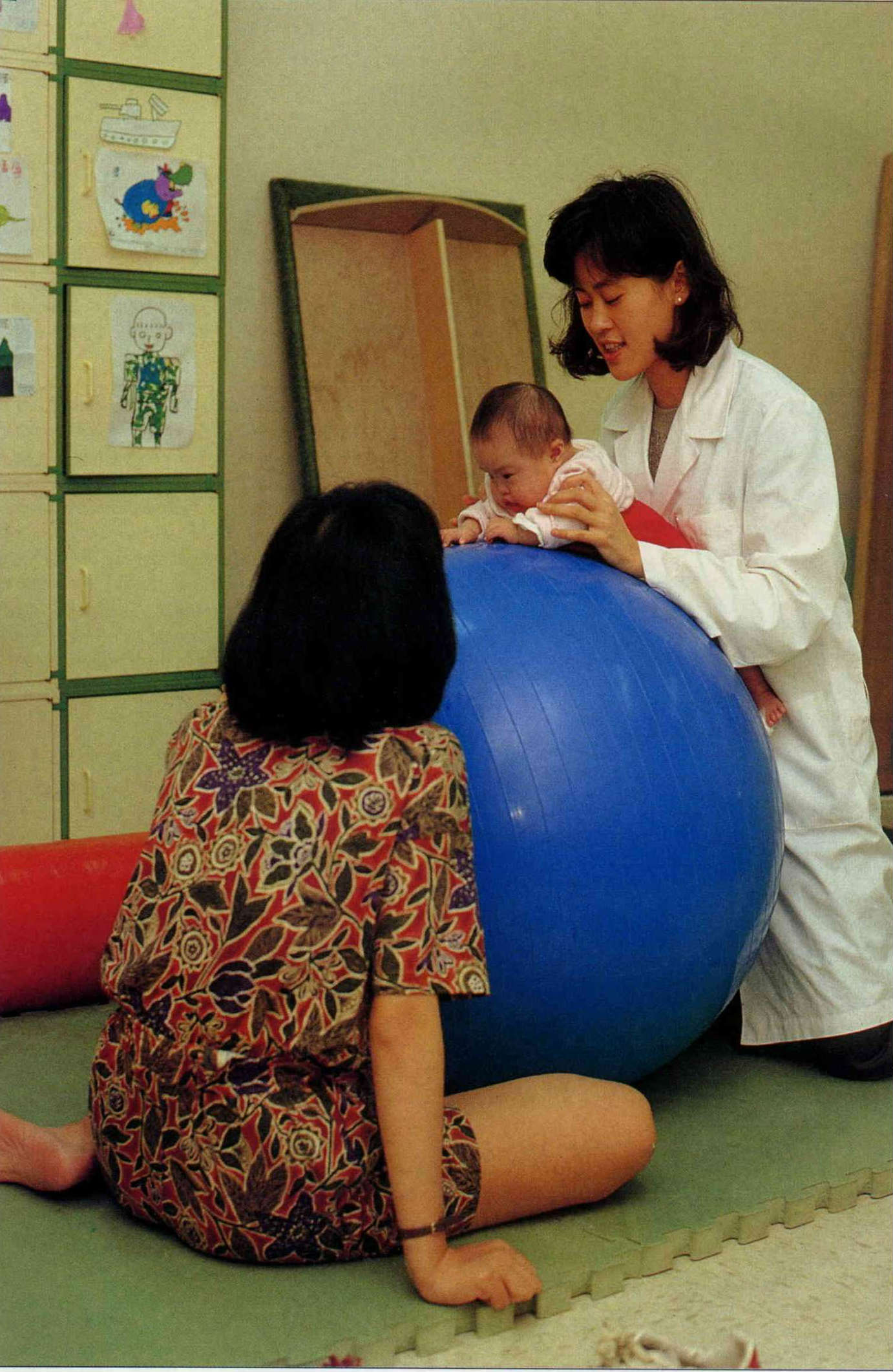 This large ball is important in early treatment. It helps to strengthen the muscles of the child's neck, waist, back, etc.