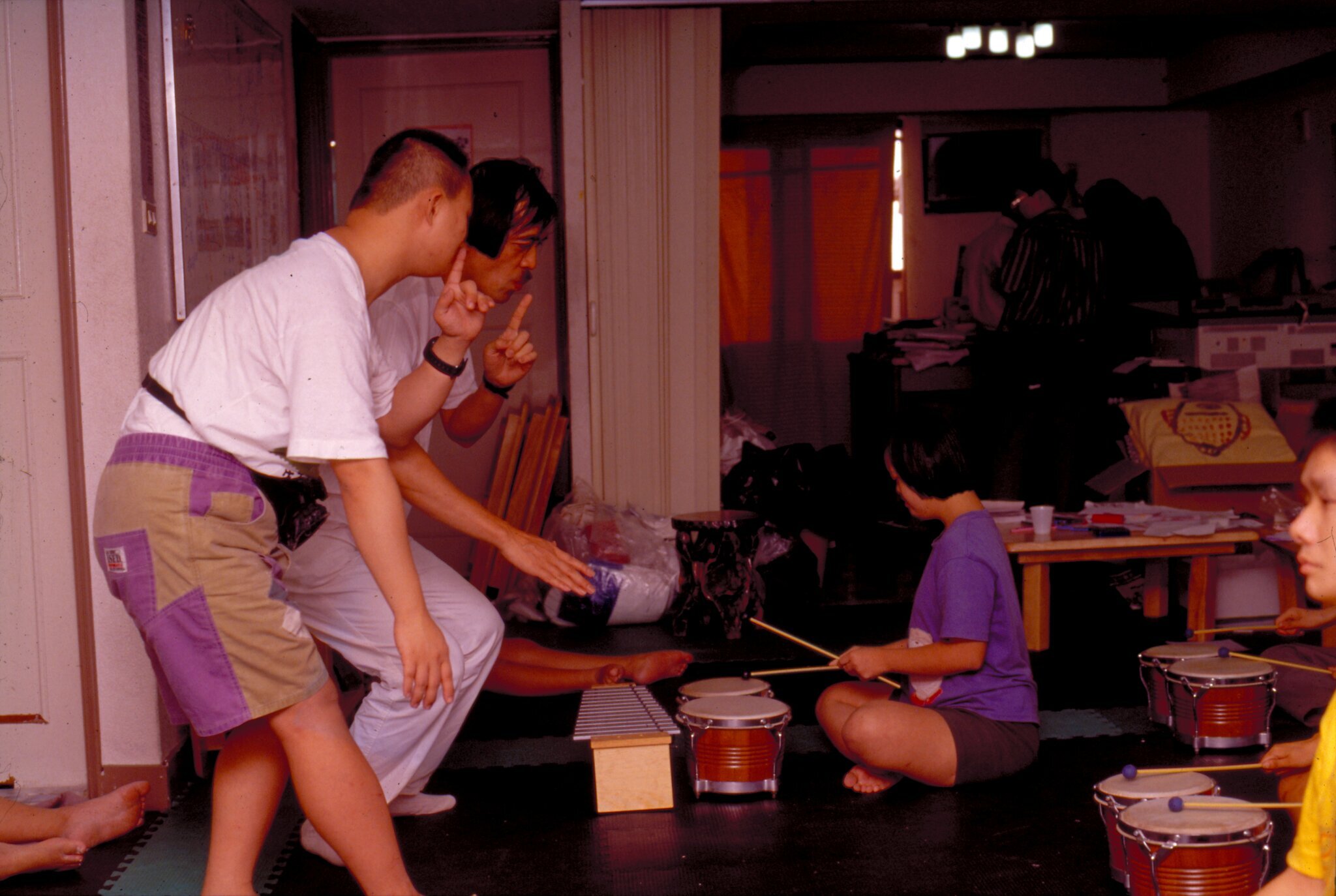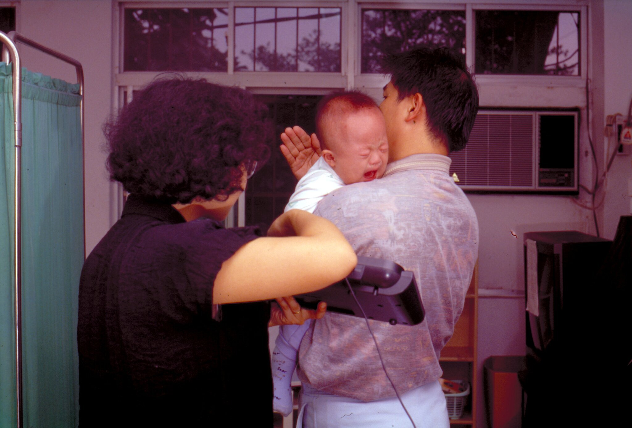 Chih-jen is sick. Today in physical therapy class he cries loudly and has no reaction to music that he usually loves. His anxious father, covered with sweat, continually pats him.