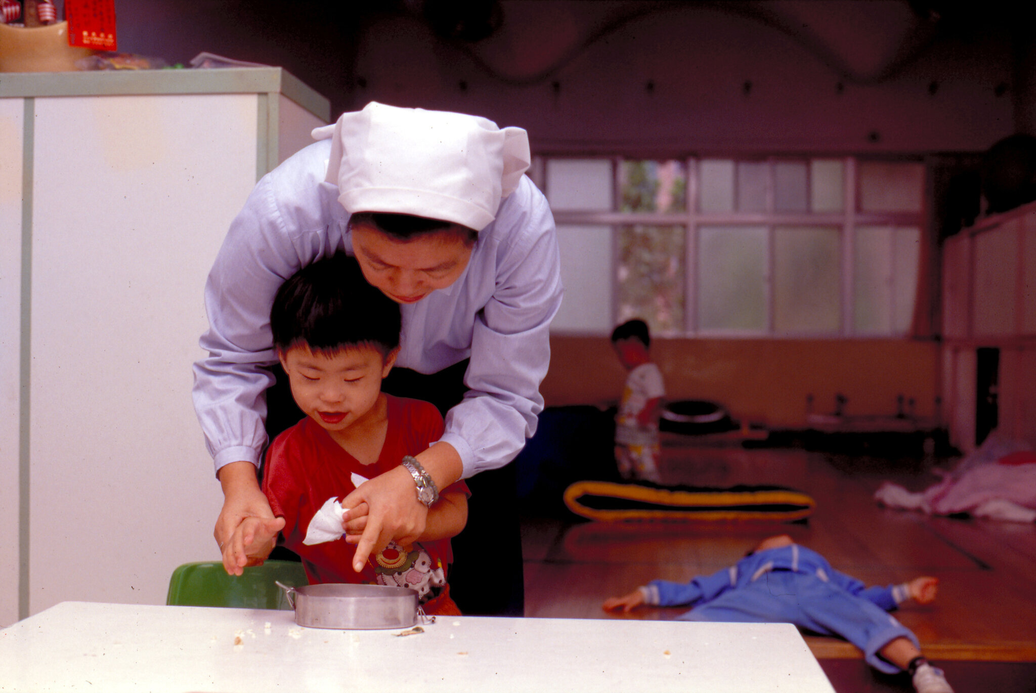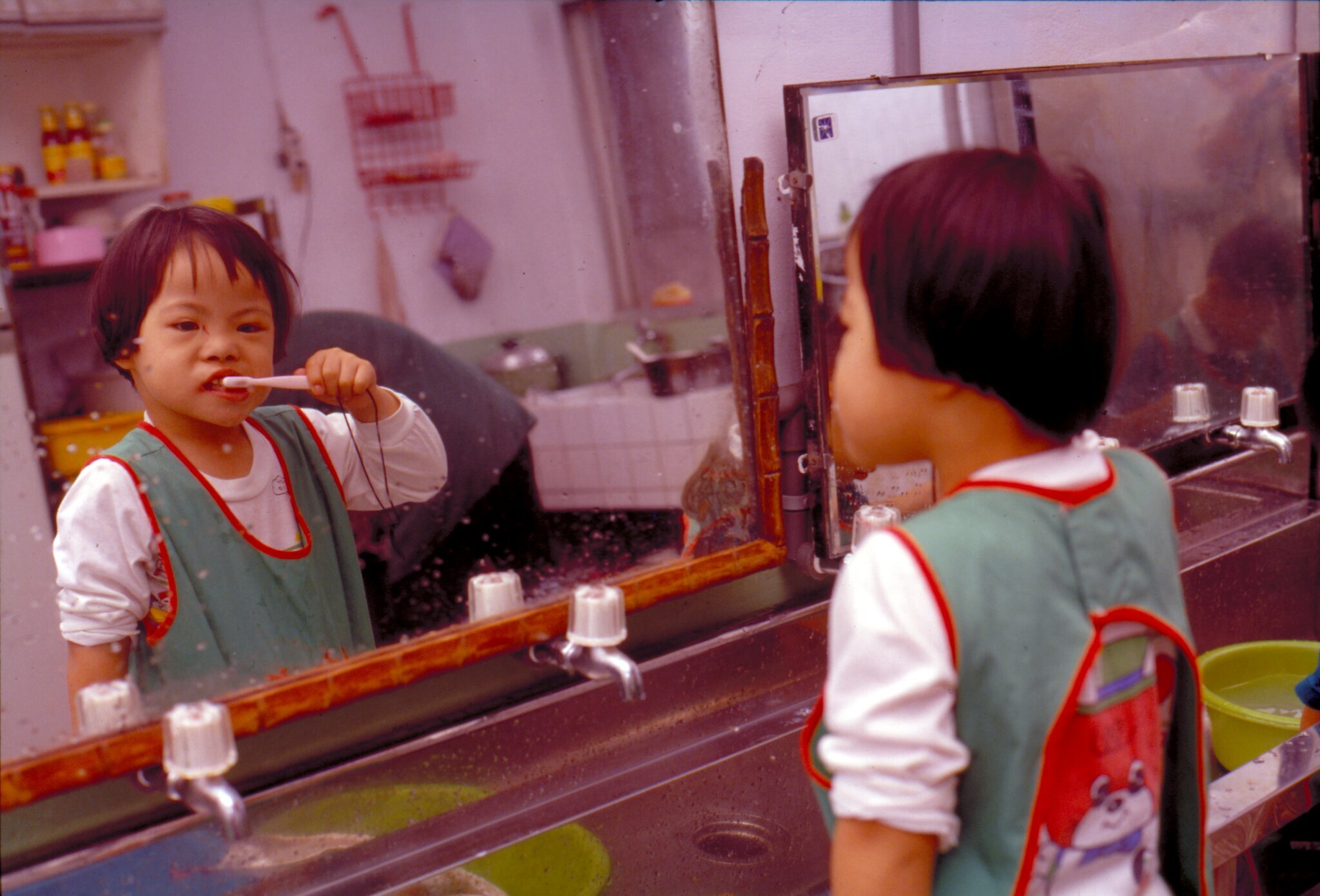The younger the better: The IQs of most children with Down's syndrome fall between 45 and 57--moderately retarded on a scale where 100 represents a child of average intelligence. Sister Huang Hui-chuan, the director of the Yujen Education Center for the Retarded, says that Children with Down's lack logical reasoning abilities but can imitate and remember. In educating this kind of child, if you practice something over and over and take things patiently a step at a time, they will eventually get it. Take washing one's hands, for instance. It is divided into the four steps of touching the soap, rubbing one's hands, rinsing with water and turning off the tap. Once they have mastered these steps, they will do the job thoroughly and assiduously.
