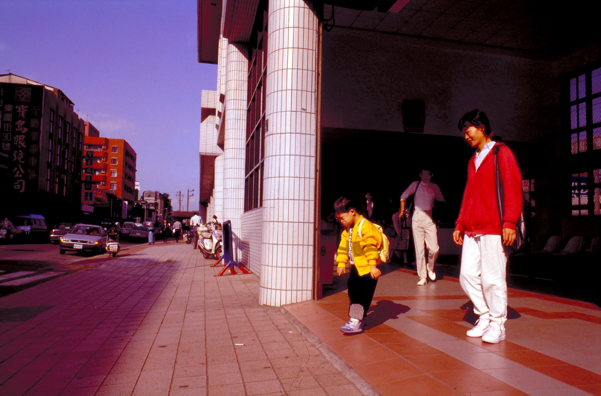 At a train station where the people and cars are relatively few, Chih-ping's mother lets him carry a bookbag on his back and walk by himself. Every day the mother and son take the train from Patuto school in Taipei so that he can get better treatment and education.