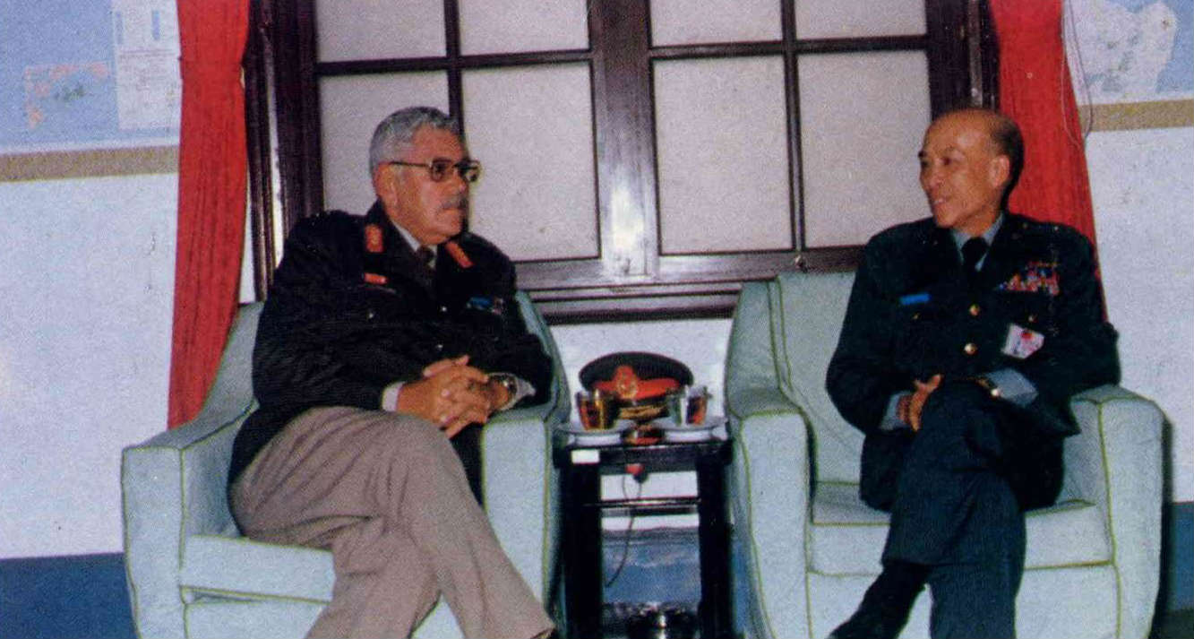He takes time out from his routine to receive foreign guests interested in ROC views on political warfare. Shown here is meeting with General J. R. Dutton of South Africa.