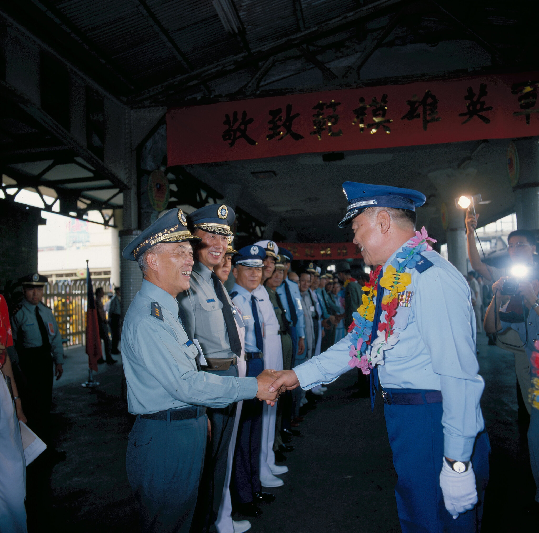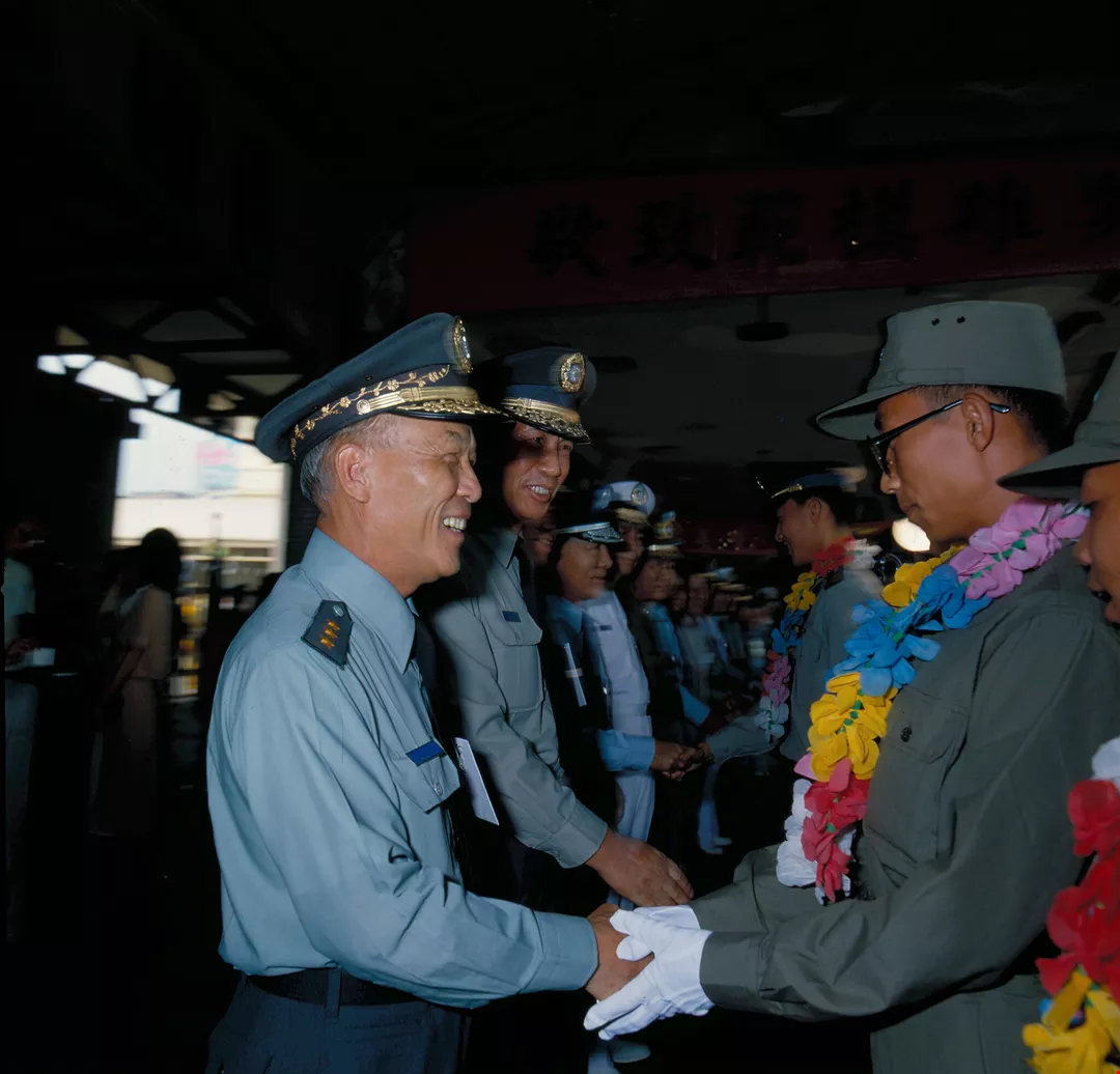 On Armed Forces Day, September 3, General Wang receives model service men on their arrival at Taipei Railway Station.