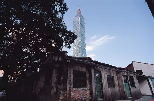 44 South Village, located in Taipei's Hsinyi District, is the earliest military dependents' village in Taiwan, and has been preserved as a historic site. Its image contrasts with that of nearby Taipei 101, symbolizing memories of different eras of this tract of land.
