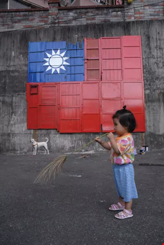 A group of artists entered Hsienkuang Village 2 in Taoyuan and made a national flag from old wooden doors and paint, symbolizing the unswerving patriotism of the village veterans.