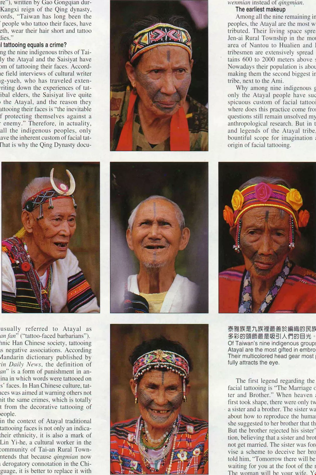 Most people still retain a certain awe for the taboos and totems of indigenous communities. Of the nine indigenous groups in the Taiwan area, the Atayal stand out for their singular practice of tattooing the face. From their point of view, not only do these markings serve as signs of membership in the tribe and symbols of adulthood, they have etched out an impression of an era. The only thing is, within the next decade, this extremely special custom is very likely to disappear.