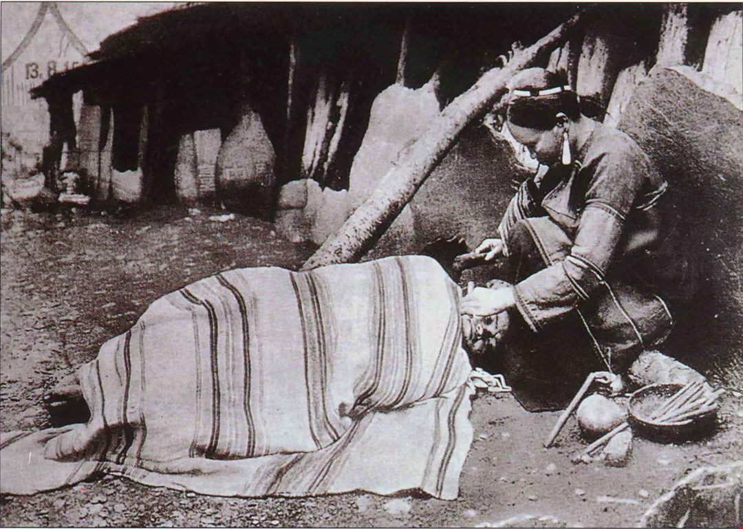 Usually, when their children reached the age to have their faces tattooed, parents would determine the exact date through dream-interpretation, then they would invite a tattooist. Before the actual tattooing, they had to perform "bird divination," by listening to a bird's singing and observing the direction in which it flew to determine whether the moment was auspicious or ill-omened. The method of facial tattooing was to press linen threads into the charcoal ashes and draw the pattern on the cheeks. Then over the pattern, they laid iron needles spread apart like the bristles of a toothbrush, and pounded them with a hammer. The needle tips were made to pierce through the skin, and the process was repeated two or three times on every spot. Then they sprinkled the wounds with charcoal ashes to make the black color settle in.