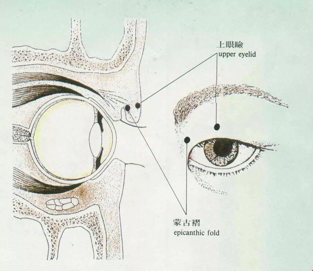 Features of the Mongoloid Eye & The drawing on the right shows the upward sweep of the outside corner of the eye and the lower curve of the inside corner. The drawing on the left shows the pronounced epicanthic fold covering the upper eyelashes.