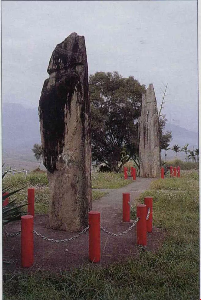 There is also a pair of large stone pillars on a riverbank in Wuho of Hualien's Juisui Rural Township. Although most of the land in the area has been turned into the Tienho Tea Plantation, luckily the stone pillars were not affected. The bottom of the pillars are caked in cement, and they are encircled by a railing. The whole setup looks quite sturdy. The pillar facing south has been reerected, and its direction is not quite accurate.