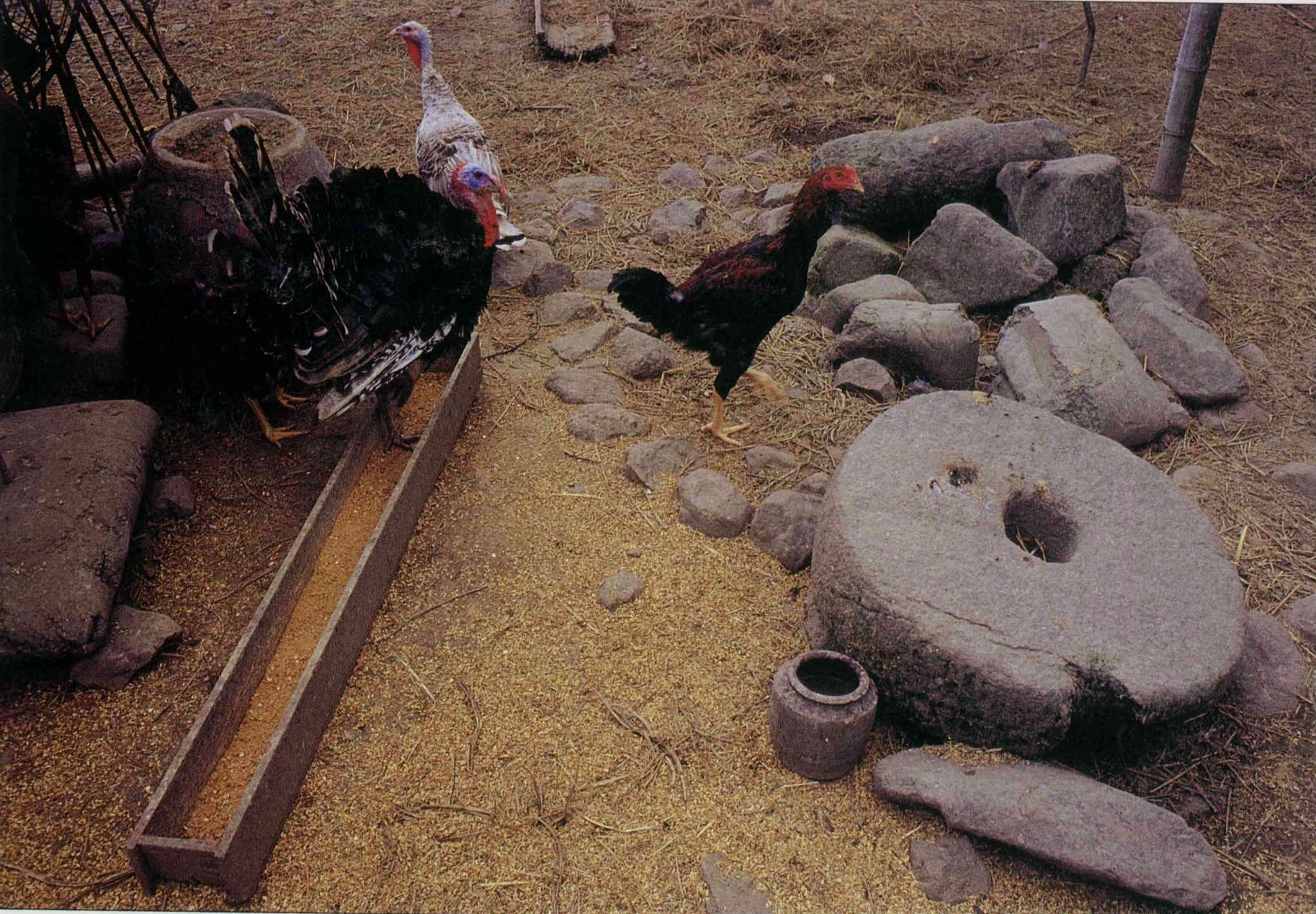 In Chungyung Village precious ancient artifacts, such as this stone wheel, are with the chickens.
