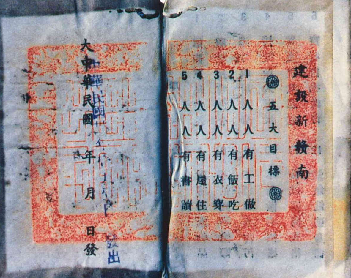 In 1941, he formally unveiled the "Three-Year Plan to Build a New Southern Jiangxi." So that "everyone has work," he opened factories and other economic facilities. So that "everyone has food," he worked hard to improve agriculture, increasing grain production and building rice-husking mills and flour factories. So that "people would have clothes to wear," he promoted the planting of cotton and the raising of silkworms, and established weaving mills and clothing factories. So that "everyone has a place to live," he planted many forests, built brick factories, foundries, nurseries and lumber mills. So that "everyone has books to read," he put a high school in every district, a junior high school in every county, and elementary schools in every neighborhood. These "five things for everyone" constituted the major goals of his campaign to build a new southern Jiangxi.