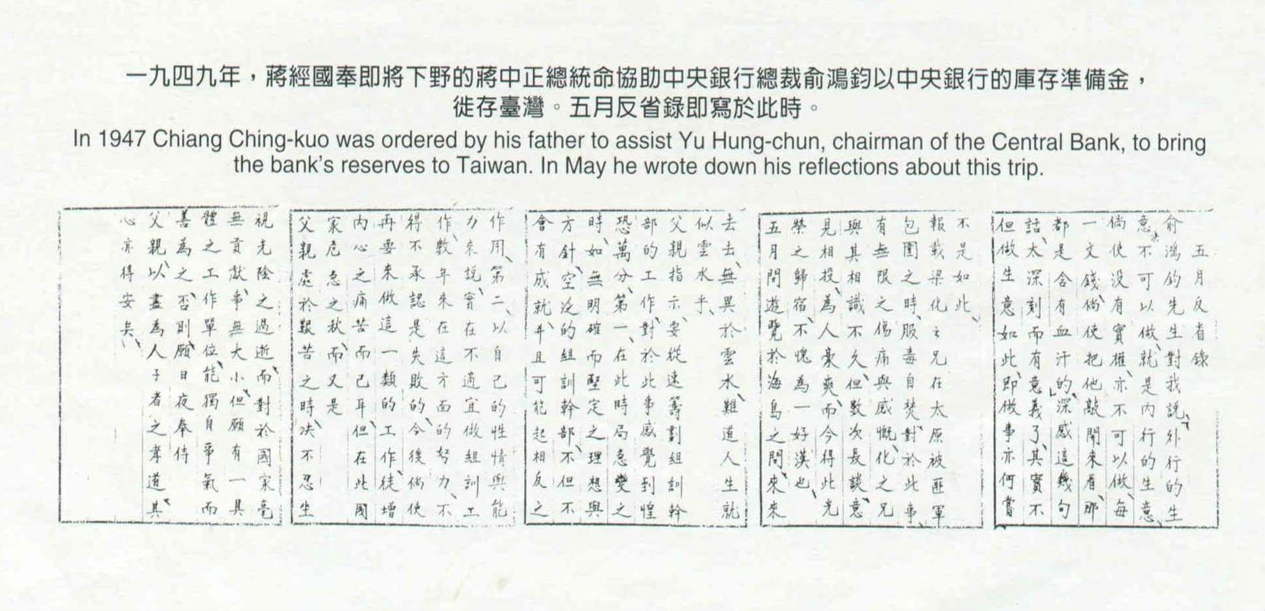 In 1947 Chiang Ching-kuo was ordered by his father to assist Yu Hung-chun, chairman of the Central Bank, to bring the bank's reserves to Taiwan. In May he wrote down his reflections about this trip.
