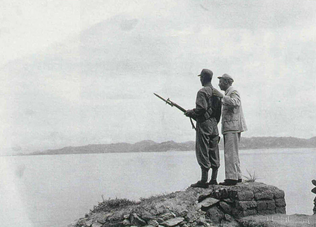 In the early period in Taiwan, Chiang, as director of political warfare at the Ministry of Defense, frequently visited the front lines in Kinmen. This photo was taken in 1954.