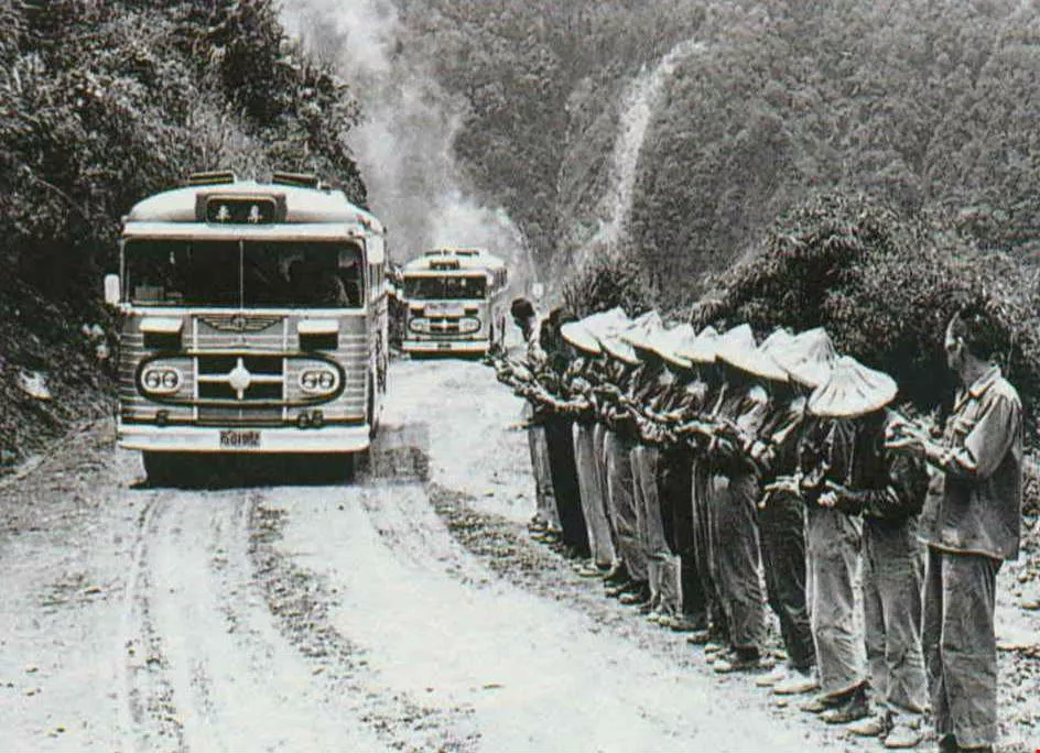 On May 3, 1960, the Central Cross-Island Highway was opened.In the photo on the right Chiang is joined by Lin Tse-shan, then director of the Taiwan Highway Bureau, and bus stewardesses.