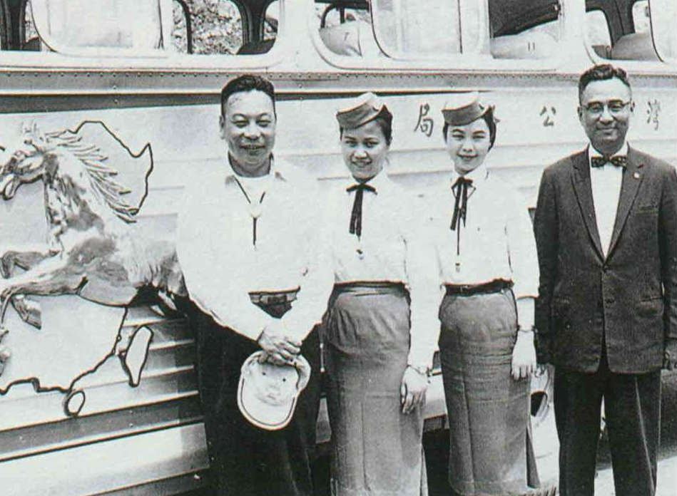 On May 3, 1960, the Central Cross-Island Highway was opened. In the photo on the right Chiang is joined by Lin Tse-shan, then director of the Taiwan Highway Bureau, and bus stewardesses.