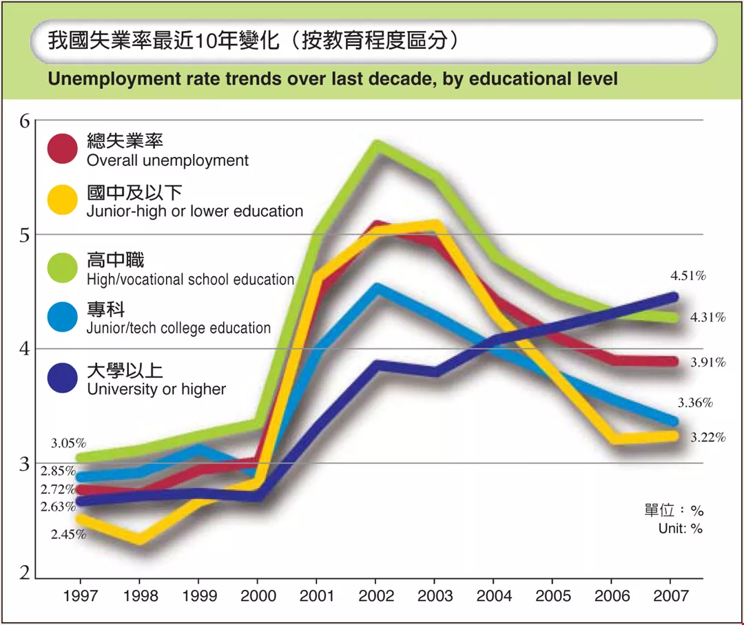 There is a ready supply of degree holders, and a higher education can no longer guarantee a job. The newest DGBAS numbers show that the unemployment rate for college degree holders in Taiwan is 4.51%, significantly higher than those for graduates of vocational school (3.36%), high school (4.31%), and junior high school (3.91%). College graduates are Taiwan's most unemployed group.