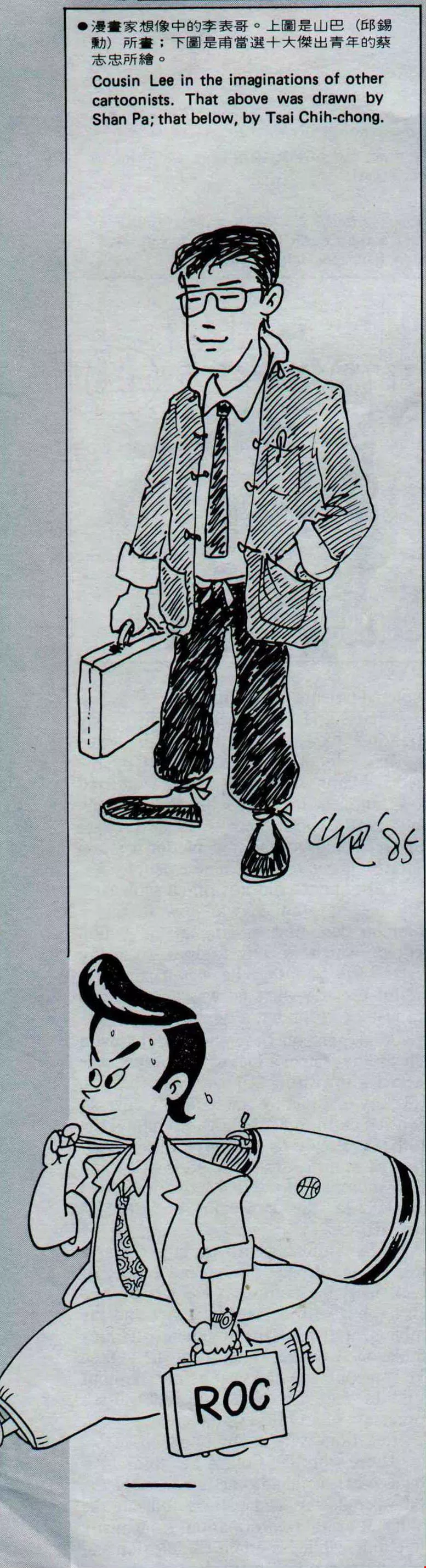 See him as you may, Cousin Lee is the first cartoon character to take on the responsibility of "representing the Chinese people." "Although he was born in the Republic of China on Taiwan," Lurie says, "I hope he will be like a torch in the dark for all Chinese to gather round--whether they are in Malaysia, Singapore, mainland China, or San Francisco."
