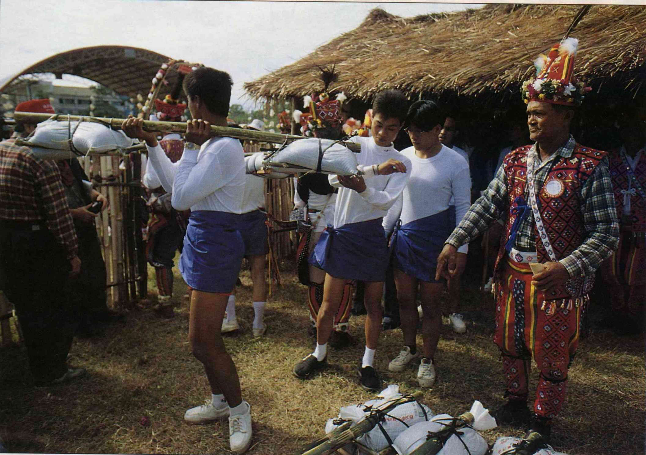 If a baby is a couple's first child or is born when the field work is light, his naming ceremony will be particularly grand. At nightfall of the child's second day, the whole tribe gathers for "Pasirawan," a feast to welcome the child into the tribe that is held in conjunction with a fish-catching ceremony. Although suckling at Mama's bosom, the child is given a place at the table and a serving of pickled meat. As the meat is served, the child's name is uttered, and she or he is thus introduced to the tribe.