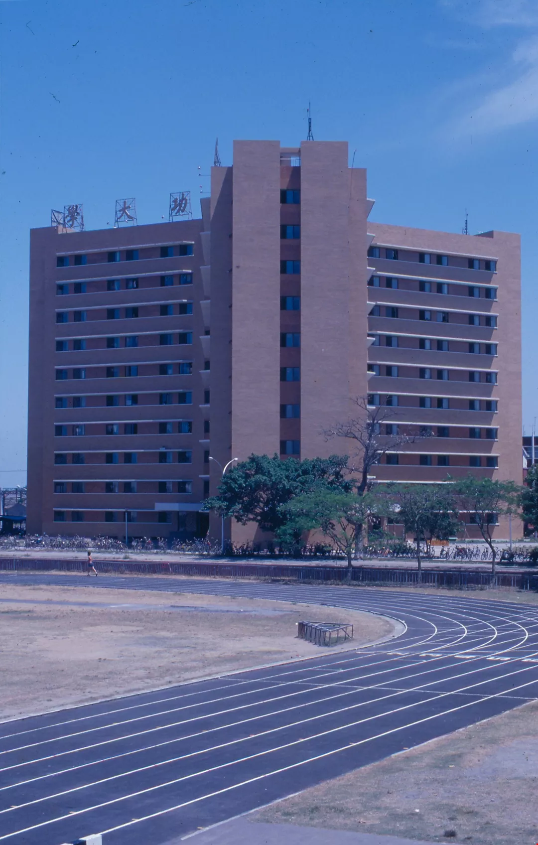 1. The Kuang-fu campus has a world standard athletes track. The 10-story men's dormitory is in the background.