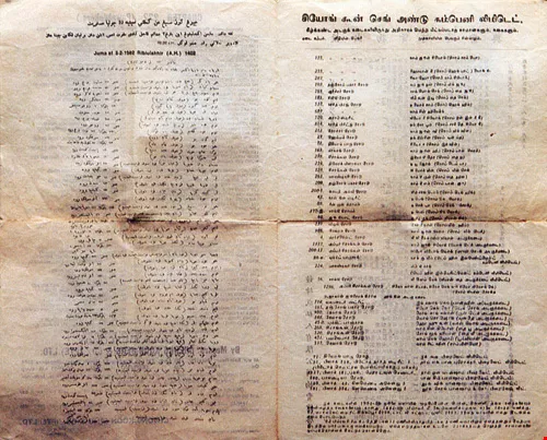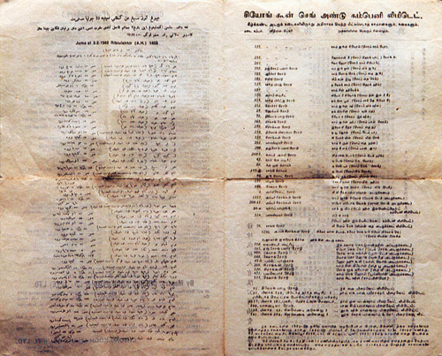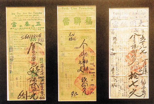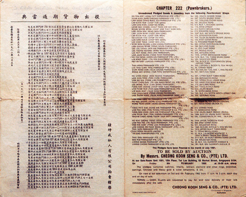 Many know what it's like to pawn their possessions to get through lean times. (above:) Pawn ticket filled out with a writing brush. (below:) Details in four languages on an auction of items forfeited to a pawnbroker. Clockwise from top left, the information is in Chinese, English, Jawi (an Arabic script adapted for the Malay language), and Tamil.