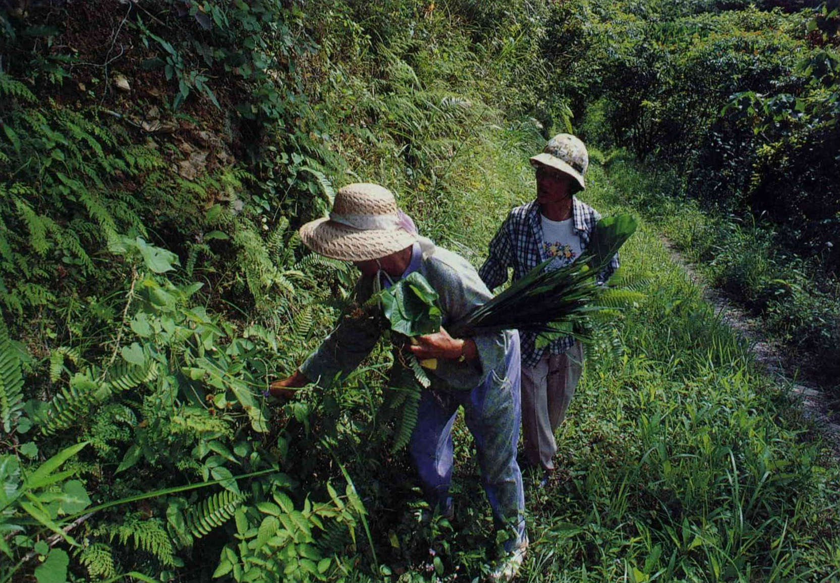 Liu was one who encouraged Lin Te-tsu to open his wild vegetable restaurant. In order to insure a steady supply of ingredients, Lin planted "wild" vegetables-including wugus, Taiwan pepper, and jiasuanjiang-in his special reserved land in the mountains. Lin's plants peacefully coexist with the natural forest on the mountain slope. There has been no need to clear the land, nor to add man-made fertilizers. As we walk through the mountain forest, which is pierced by shards of sunlight, it takes some effort to follow the nearly indiscernible small path which has been worn into the grass. Lin jokingly calls it "the mountain goat path" as he leads us into his vegetable field.