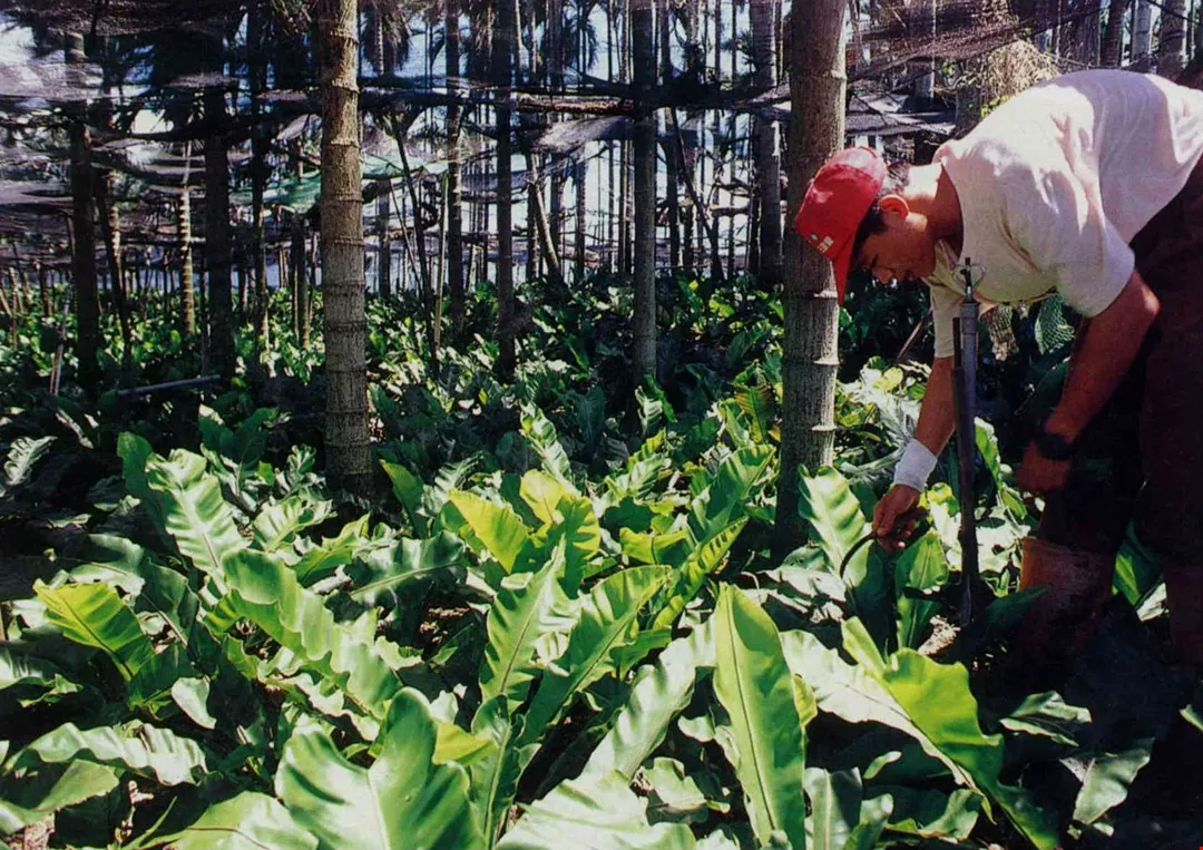 The "wild" veggie known to aboriginal people as wugus (Asplenium nidus) needs shade when cultivated over large areas. The photo shows Huang Chun-hua picking organically grown wugus. In the hands of Han Chinese, many "wild" vegetables are being "domesticated" to become cash crops.