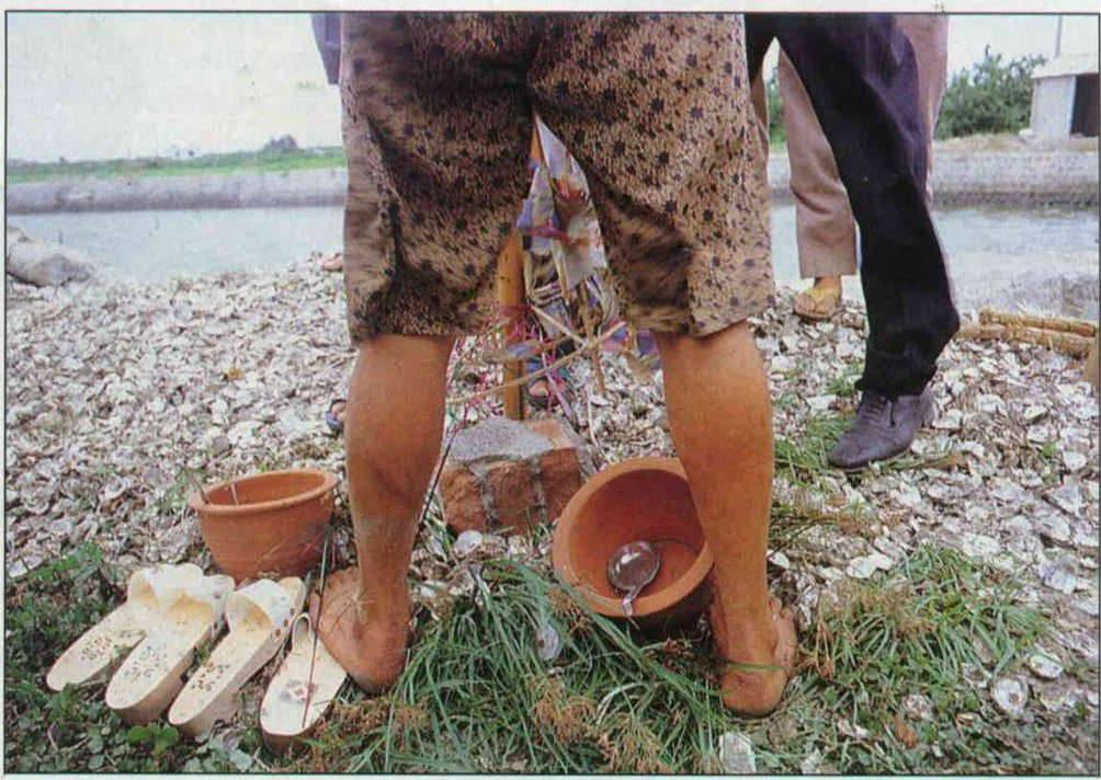 After the ch'ien-shui-ts'ang ceremony was over, Li Yu-shan, lecturer in Chinese at Fu Jen Catholic University and the oldest participant at the camp, asked: "What was the point of the water scoop and clogs used at the start of the ceremony?" Originally meant to wash and clad the feet of ancestors pulled from the muddy waters, they are now ceremonial items that demonstrate the consideration that the survivors have for those drowned. Once they understood about the ceremony, some of the camp participants volunteered to help set out the shui-ts'ang and get them spinning (which is meant to help the departed to cling on). Says Chi Su-shan, studying for an M.A. in music at the University of Illinois: "The drowned were from among the early settlers in Taiwan, who are also our forefathers, aren't they?"