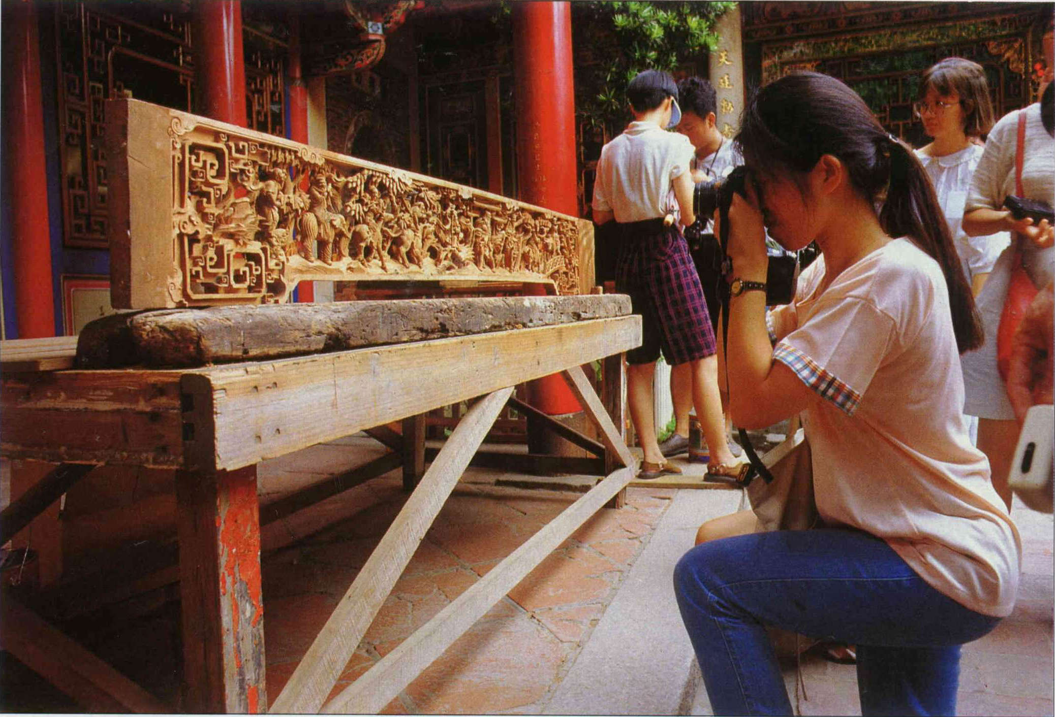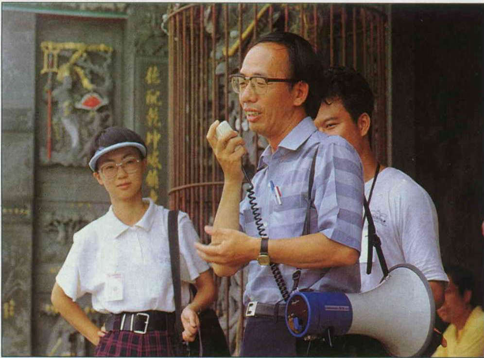 The cement cast pillars and floors that were fitted that year will be replaced with carved pillars and six-inch cobblestones in the original style. An exception is the pair of cement cast dragon pillars in front of the entrance, which will not be replaced. Lin Yung-tsun points to pillars, explaining: "Firstly they are well made, and secondly, keeping them helps people to know this little part of history, for the last restoration was not ideal but it was a part of Shui-hsien Temple's history." Also, after seeing building work at Ch'ao-t'ien Temple in Peikang, group members discussed with the director of the temple how temple authorities can handle the current craze for electric organs and gaudy floats at religious events, and asked how temples put the flood of donations to use. Questions that were about real living temple culture, and not just about the construction that they could see in front of them.